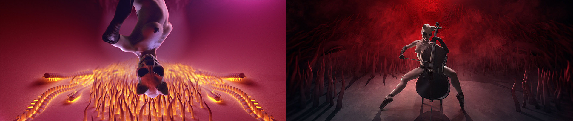 Based on a carefully planned animatic and mastering precise and dynamic 3D camera movements, Gio went to great lengths to ensure that every moment of the video was seamlessly integrated with its sound. Focusing on each character and location, Paola Rocchetti’s discerning taste and natural flair for makeup and styling was a key element curating the aesthetic of the video. With contributions from Dead Lotus Couture (London), Mother of London (LA), Majesty Black (LA), Pieroni Lab (Rome), Oscar-winning makeup artist Manlio Rocchetti (1943-2017), and Oscar-winning 3D artist Stefano Dubay, Gio and Paola successfully brought their vision to life.